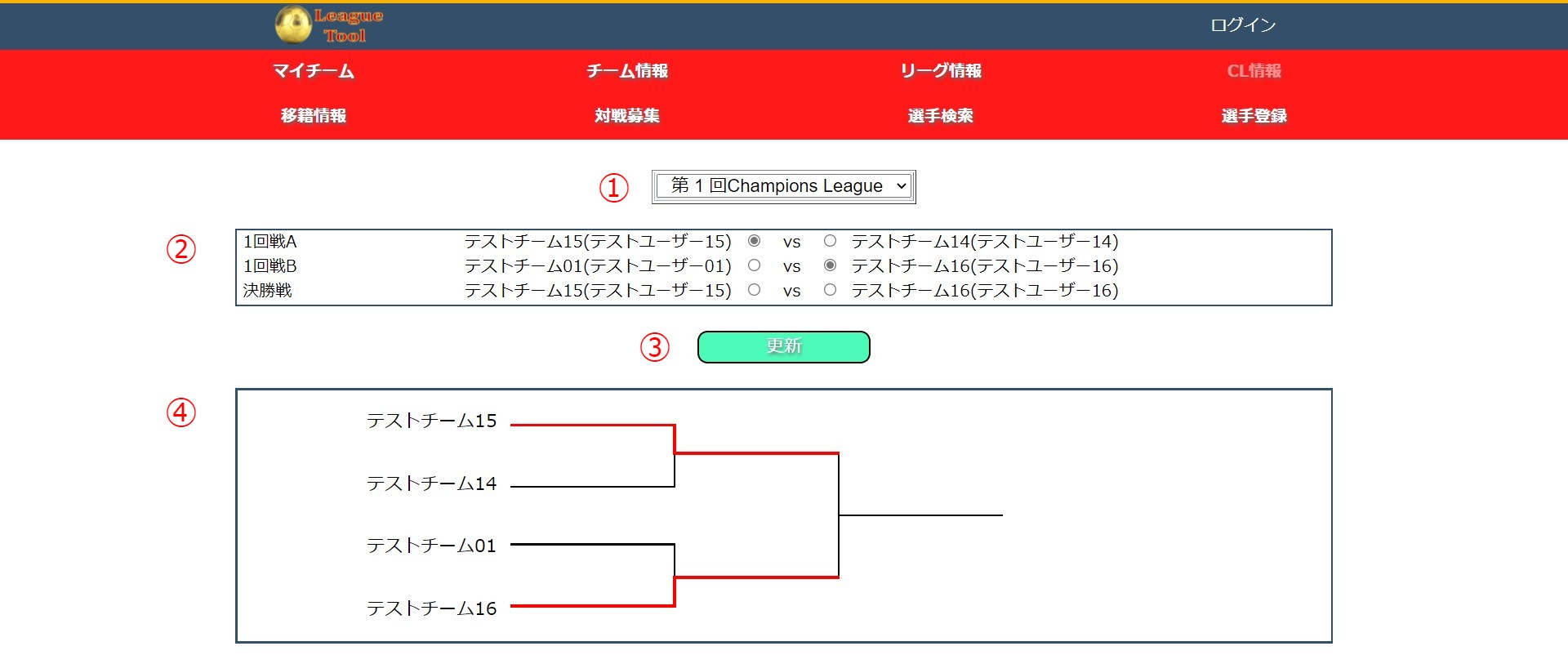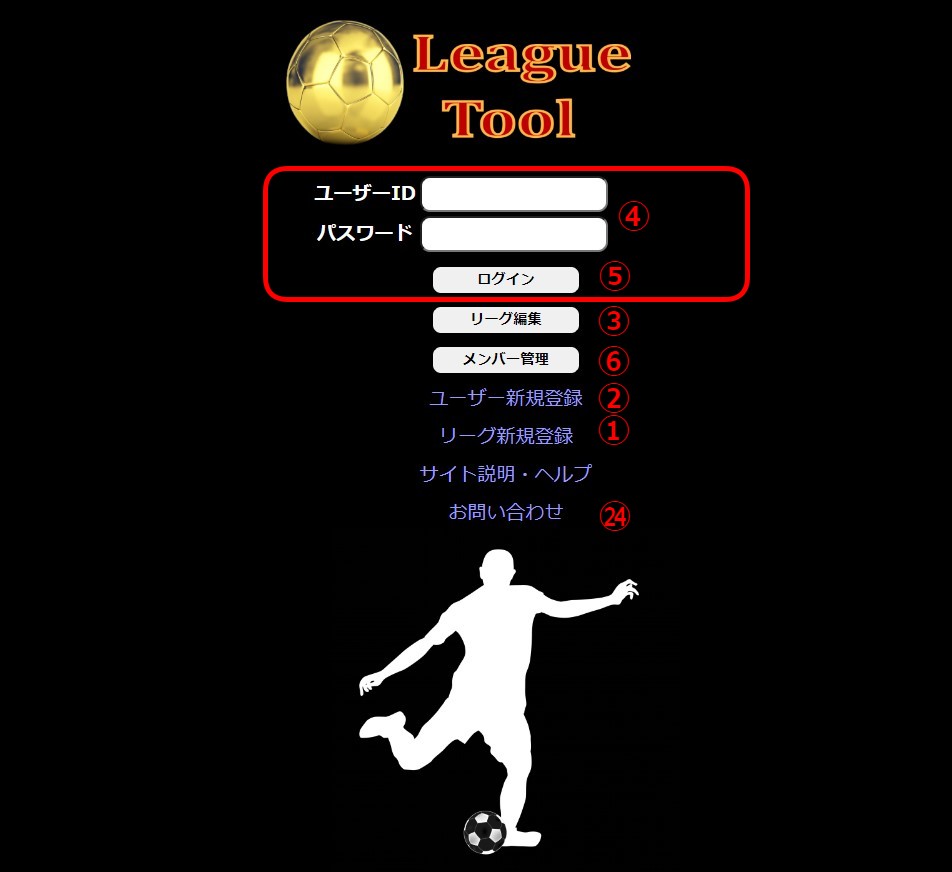 個人毎のユーザーID・パスワードを④に入力し⑤ログインボタンを押下すると所属リーグにログインします。