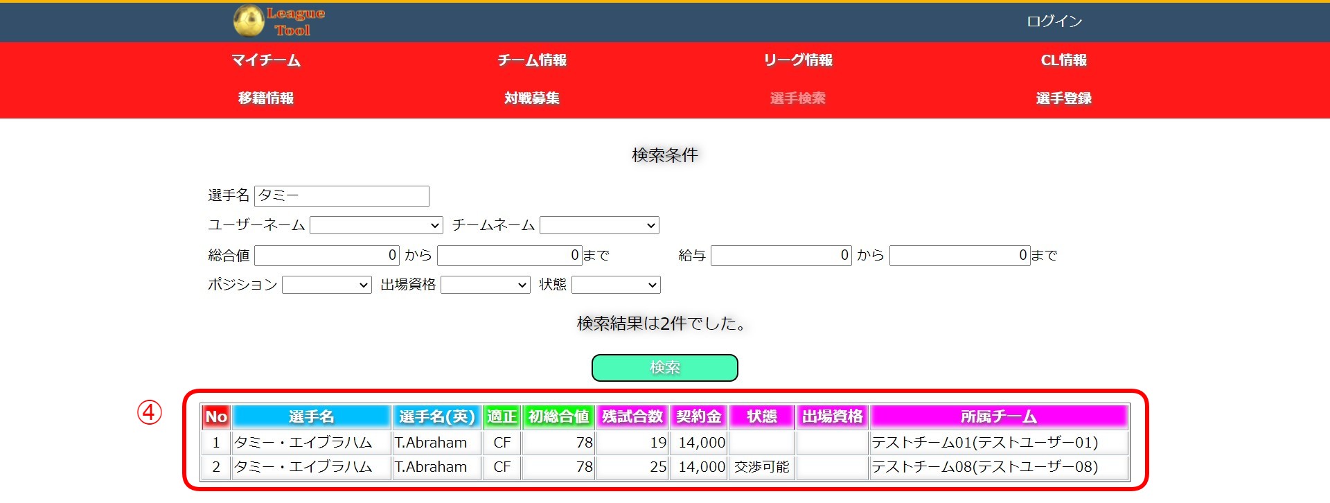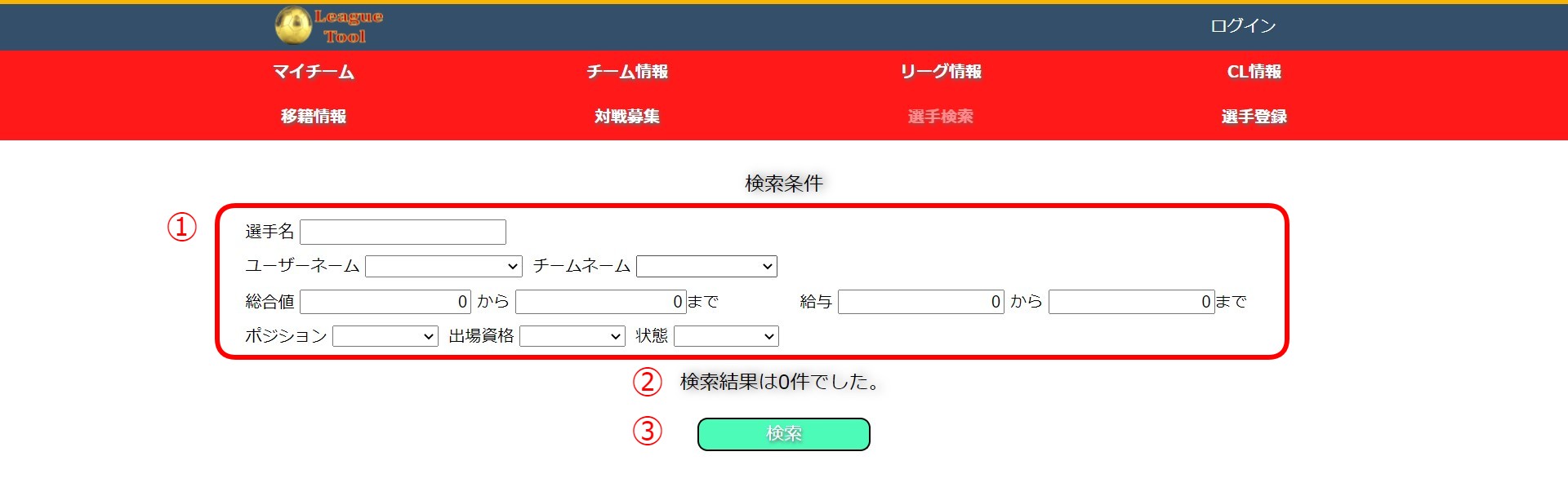 選手データの検索が可能です。データベースに登録があるか、使用したい選手を他チームが保有しているか、移籍交渉が 容易かなどの確認に使用します。使用方法は以下のとおりです。