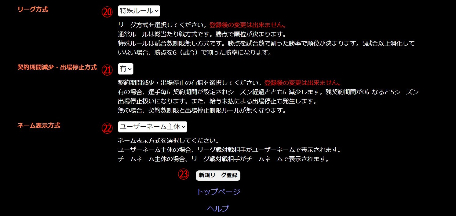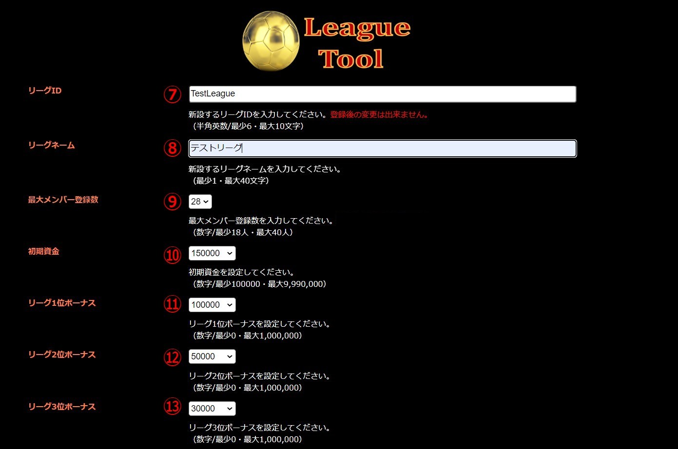 新規登録画面にて新規リーグIDを登録すると新リーグが設立される。設定は以下のとおり。