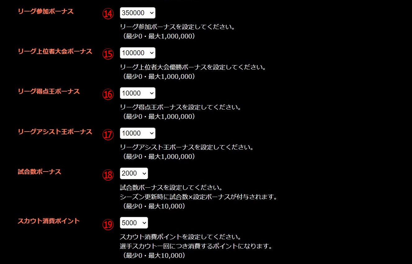 シーズン更新時に付与されるリーグ得点王ボーナスを設定します。