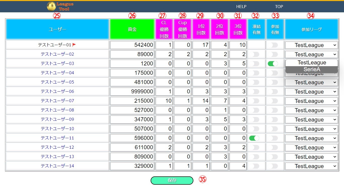 作成済リーグ状態を変更する場合は「③リーグ編集ボタン」を押下しリーグ設定編集を行います。