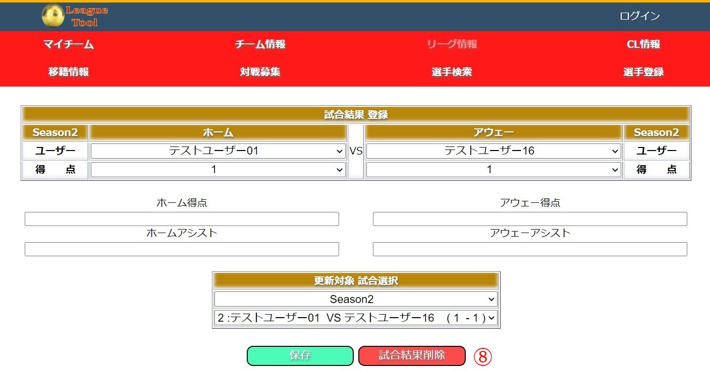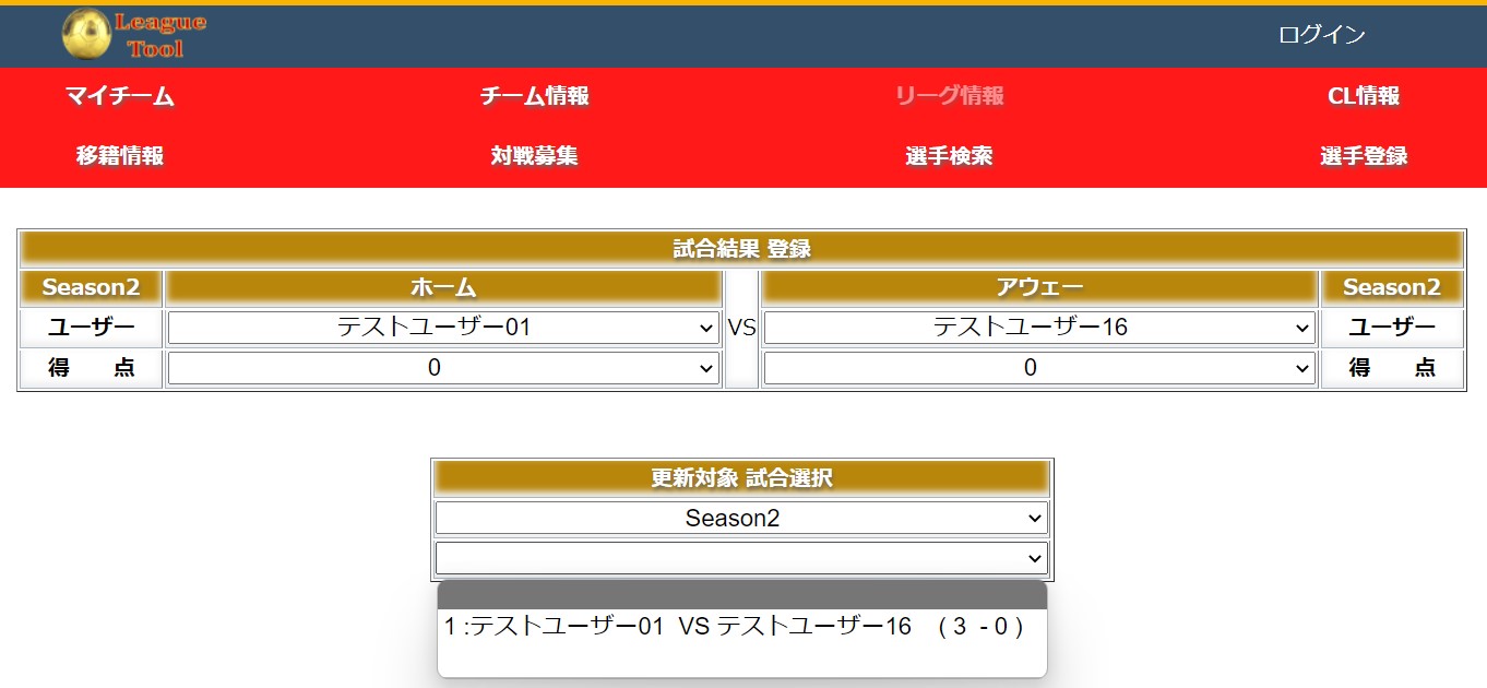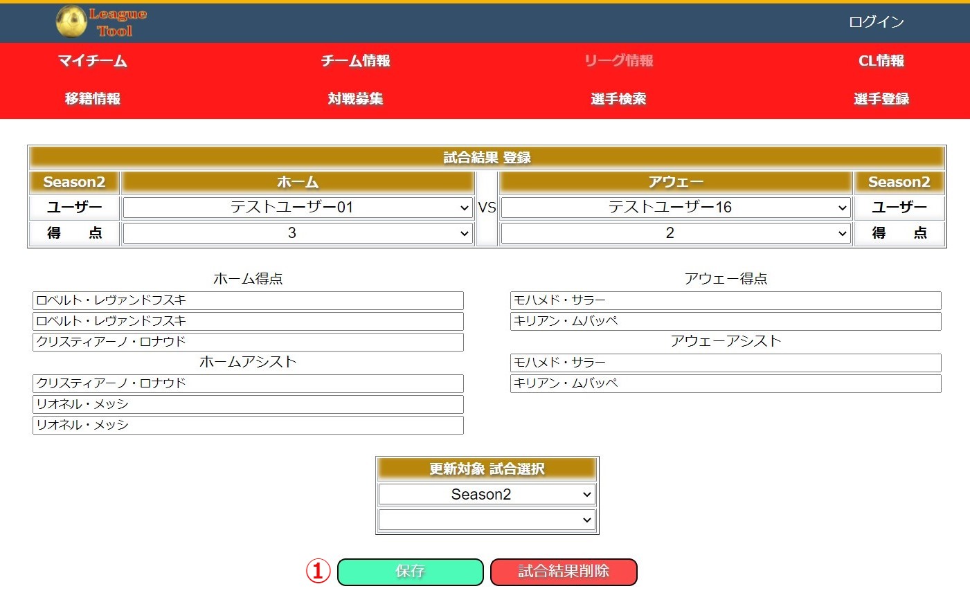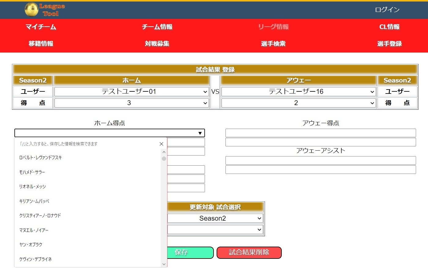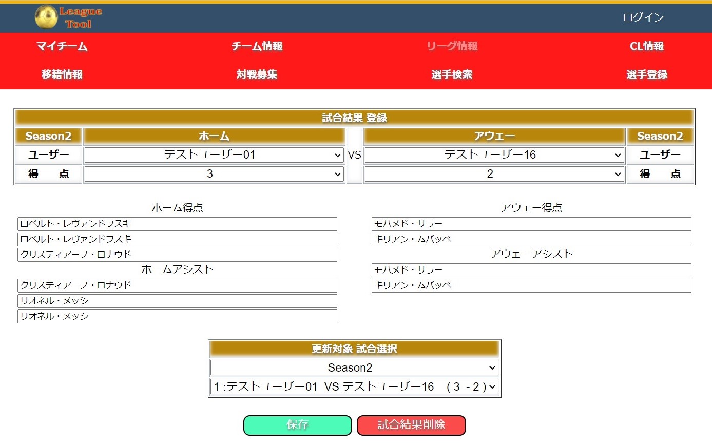 リーグ情報の閲覧・編集が可能な画面です。「ホームユーザー」「アウェーユーザー」「ホーム得点」「アウェー得点」 を入力し試合を登録します。「ホーム得点」「アウェー得点」が1点以上の場合、得点・アシスト選手入力欄が表示されます。 得点・アシストは任意登録になります。入力した場合、得点・アシストランキングに集計され、シーズン終了時の集計時に 得点王ボーナス、アシスト王ボーナスが付与されます。