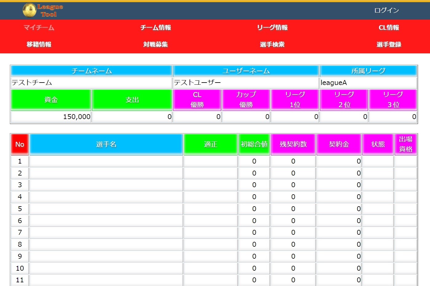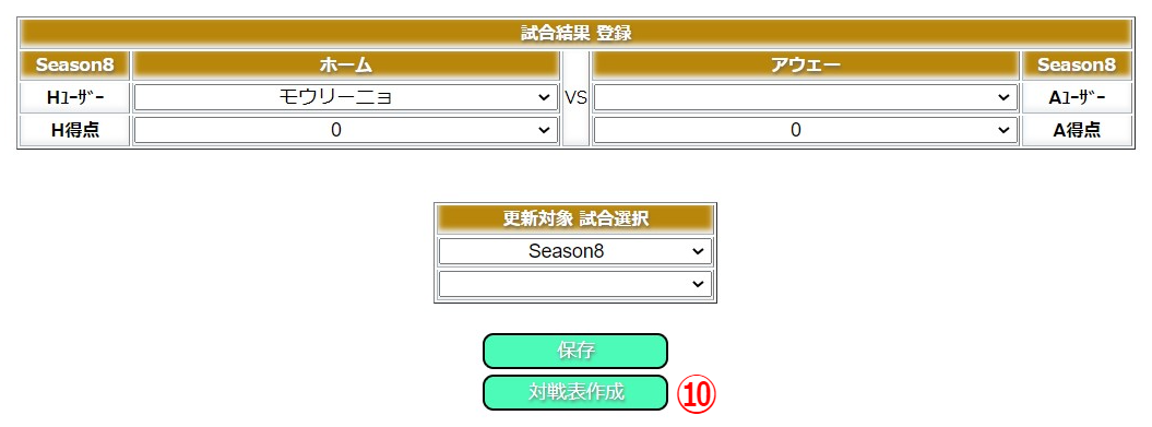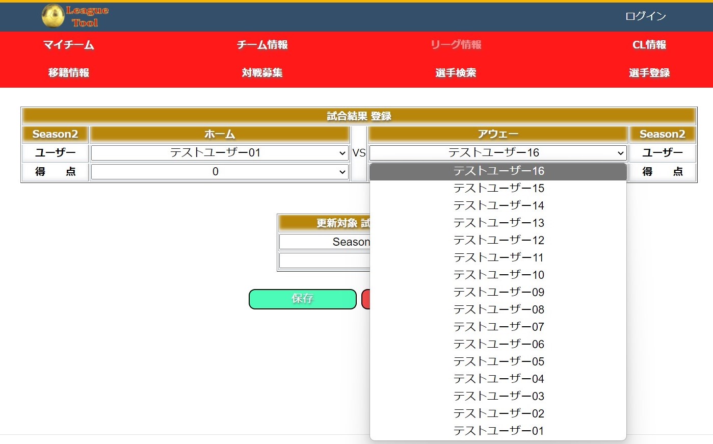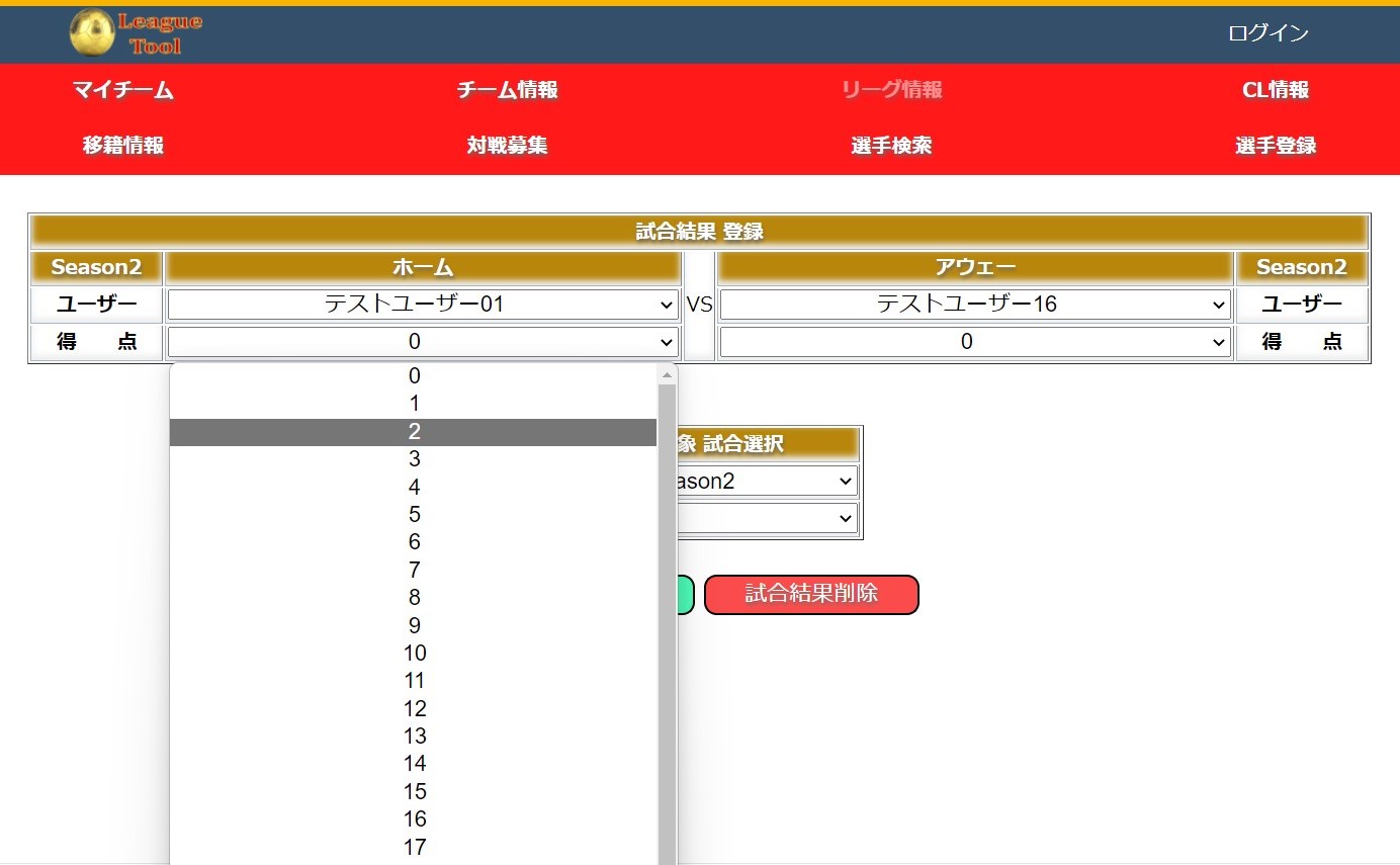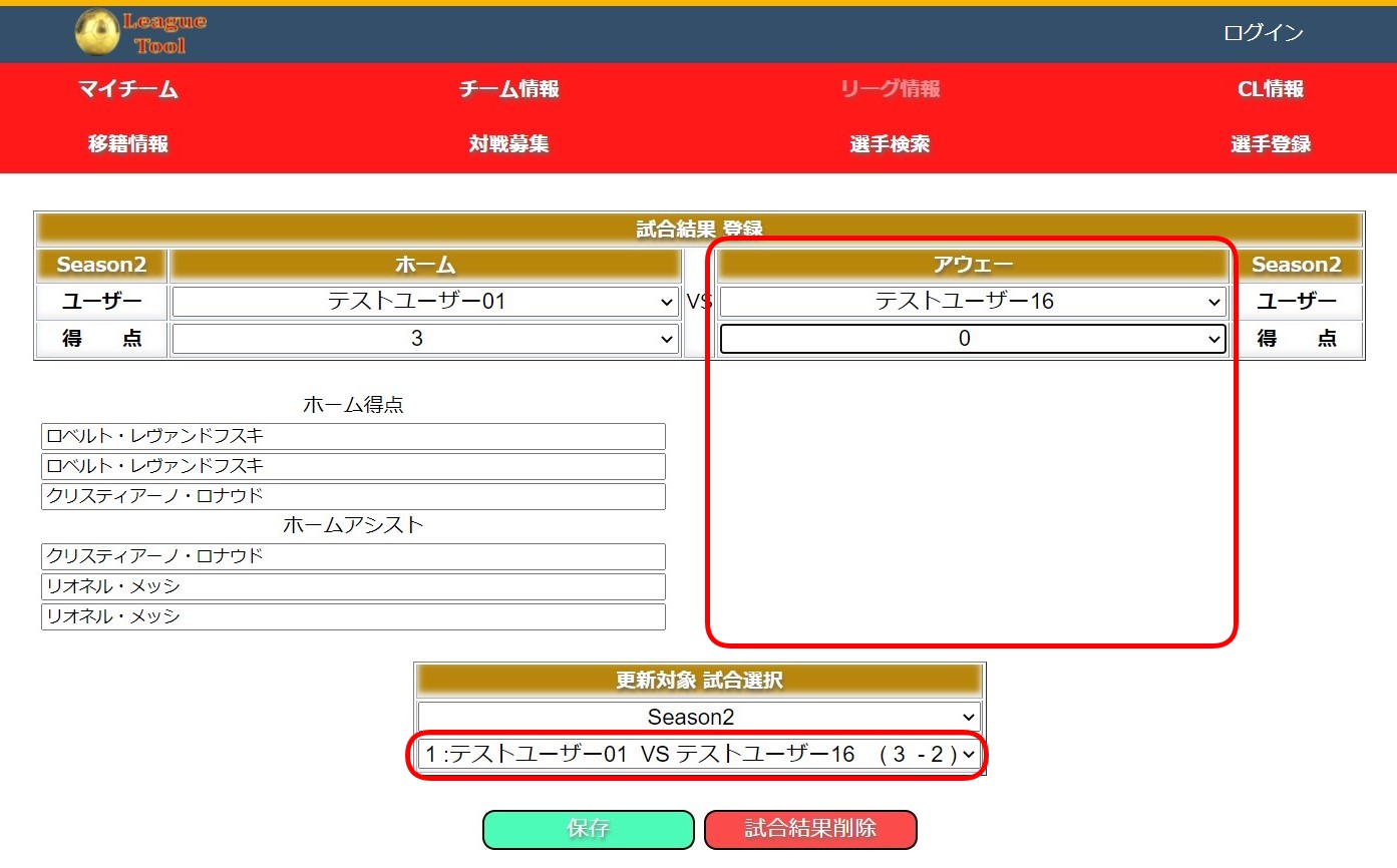 リーグ情報の閲覧・編集が可能な画面です。「ホームユーザー」「アウェーユーザー」「ホーム得点」「アウェー得点」 を入力し試合を登録します。「ホーム得点」「アウェー得点」が1点以上の場合、得点・アシスト選手入力欄が表示されます。 得点・アシストは任意登録になります。入力した場合、得点・アシストランキングに集計され、シーズン終了時の集計時に 得点王ボーナス、アシスト王ボーナスが付与されます。