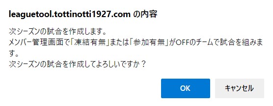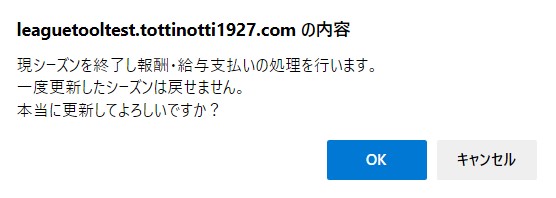 「⑨シーズン更新ボタン」を押下すると以下のメッセージが表示されます。OKを選択すると現シーズンを終了し各ボーナス等の計算を行い新シーズンを迎えます。 一度更新したシーズンは戻せないため慎重に作業をお願いします。シーズン更新が行えるのはリーグリーダーのみと なります。