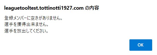 「③獲得ボタン」を押下すると選手獲得になります。ただし、登録メンバーに空きがない場合は以下のメッセージが表示されます。