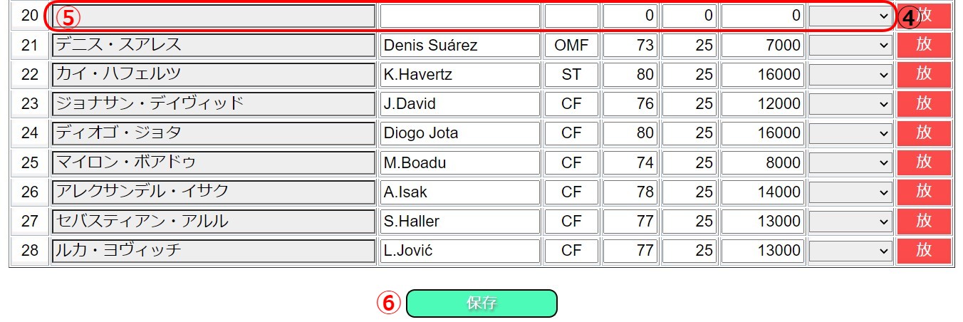 (注意)選手獲得後、登録メンバーを放出し「③獲得ボタン」ではなく「⑥保存ボタン」を押下すると選手獲得は行われずに