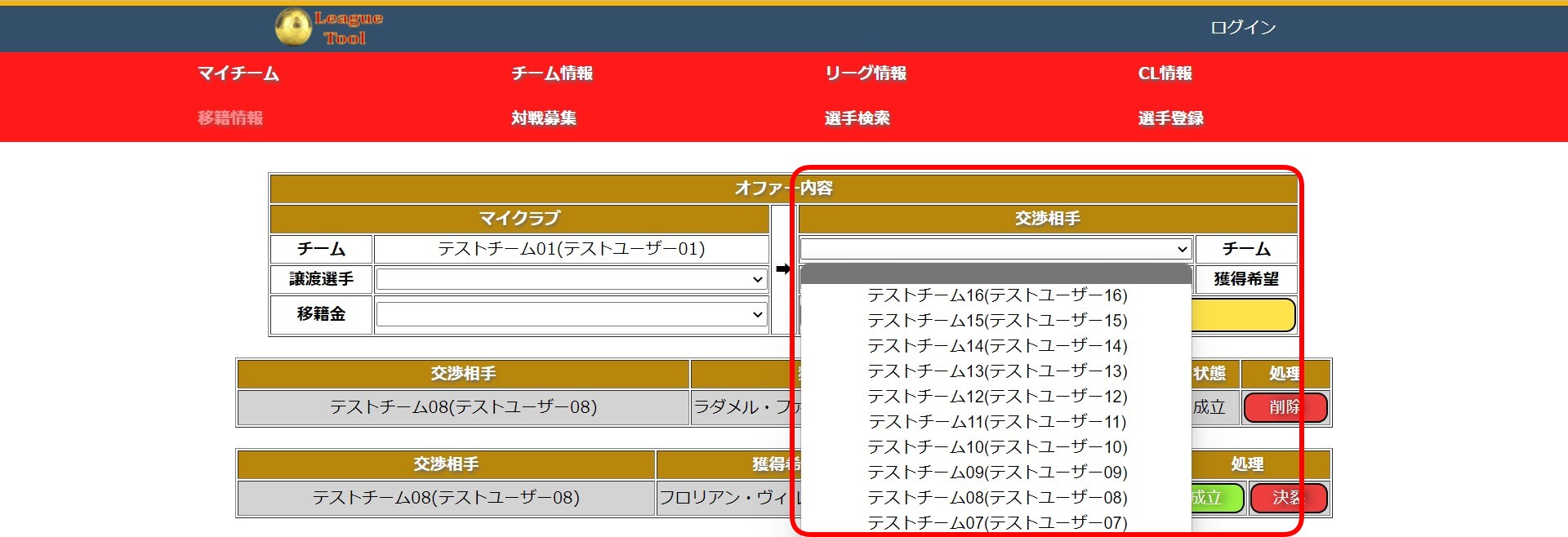 オファーを出す相手チームを交渉相手枠のチーム欄から選択します。