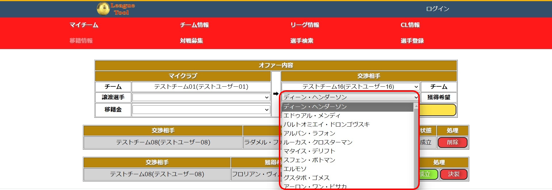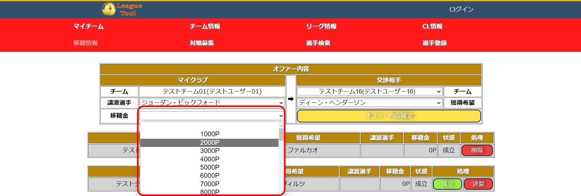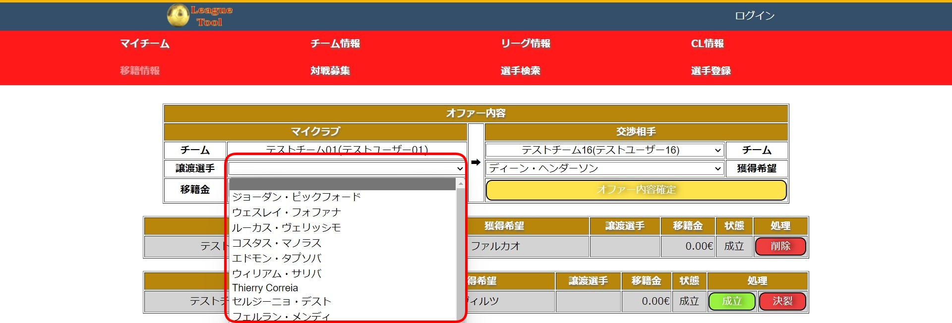 オファー申請があると⑤の枠に他チームからのオファー内容と状態が表示されます。「処理」はオファー進捗を表します。 「成立ボタン」を押下すると移籍が成立し選手と移籍金の移動が完了します。「決裂ボタン」を押下すると 交渉決裂となります。
